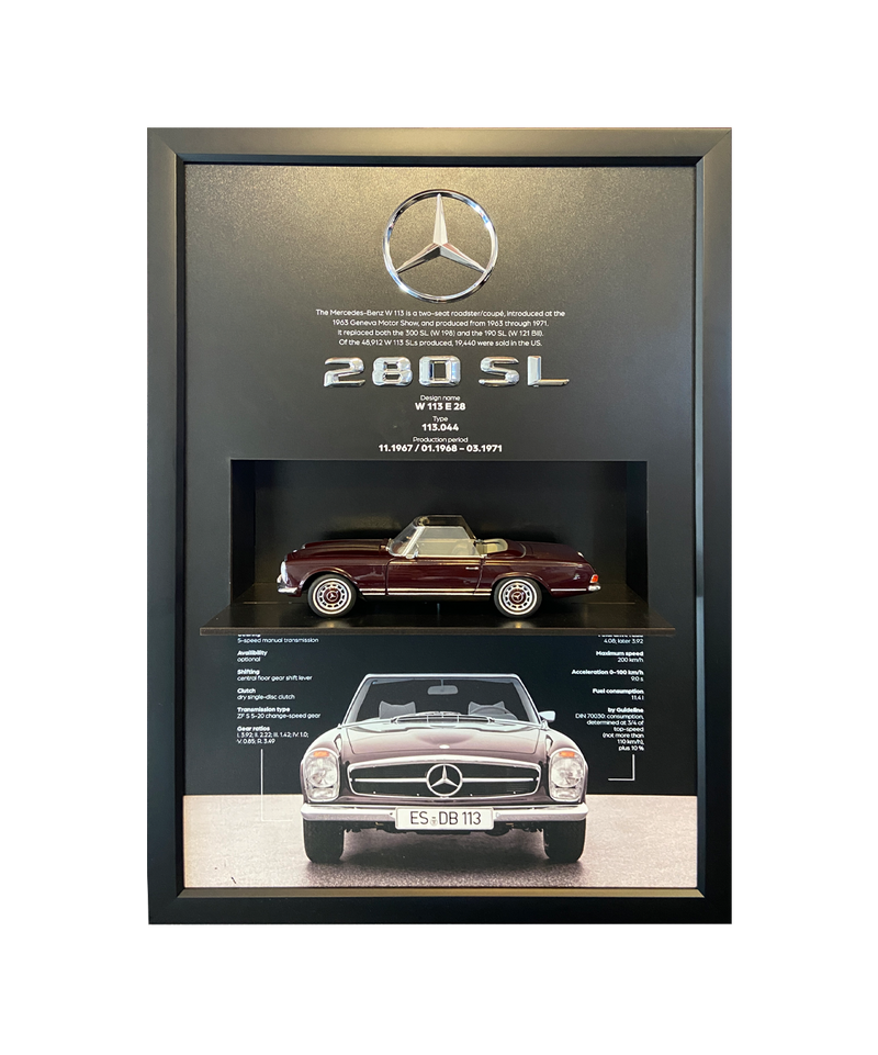 Mercedes 280 SL’in zamansız çizgileri ve detaylı bir modelle bu tabloya işlendi.
