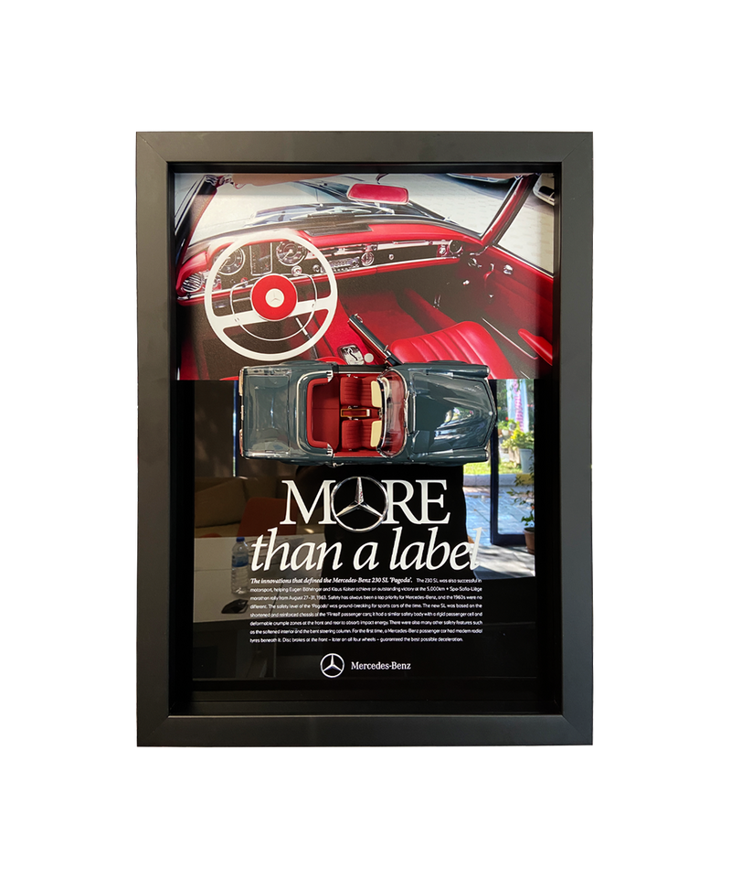 Bu tablo, Mercedes 230 SL’nin sadece bir otomobil olmadığını, aynı zamanda bir yaşam tarzı olduğunu hatırlatıyor. Özenle seçilmiş bir maket modelin kullanıldığı bu kompozisyon, nostaljiyi, özgün tasarımı ve duyguyu bir araya getiriyor.